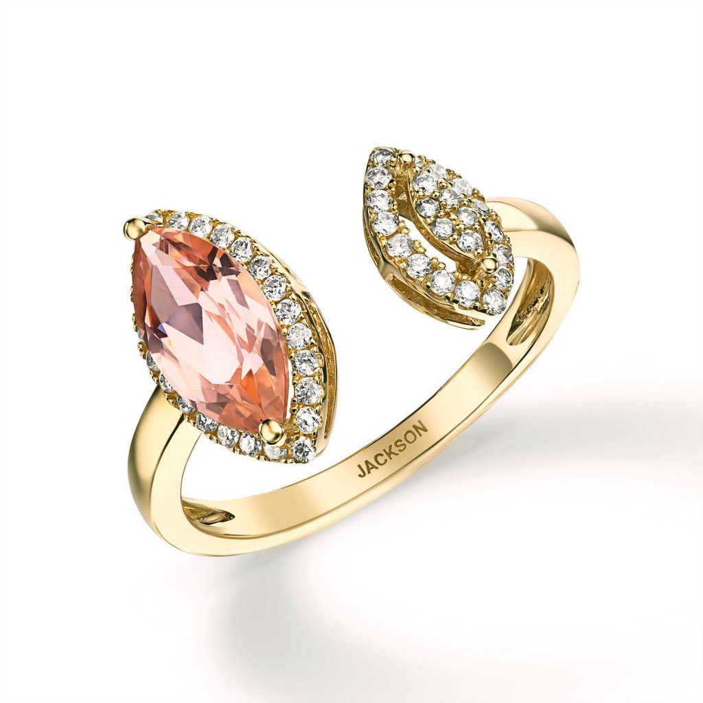 טבעת זהב 14 קראט פתוחה משובצת יהלומים ואבן חן מורגנייט.