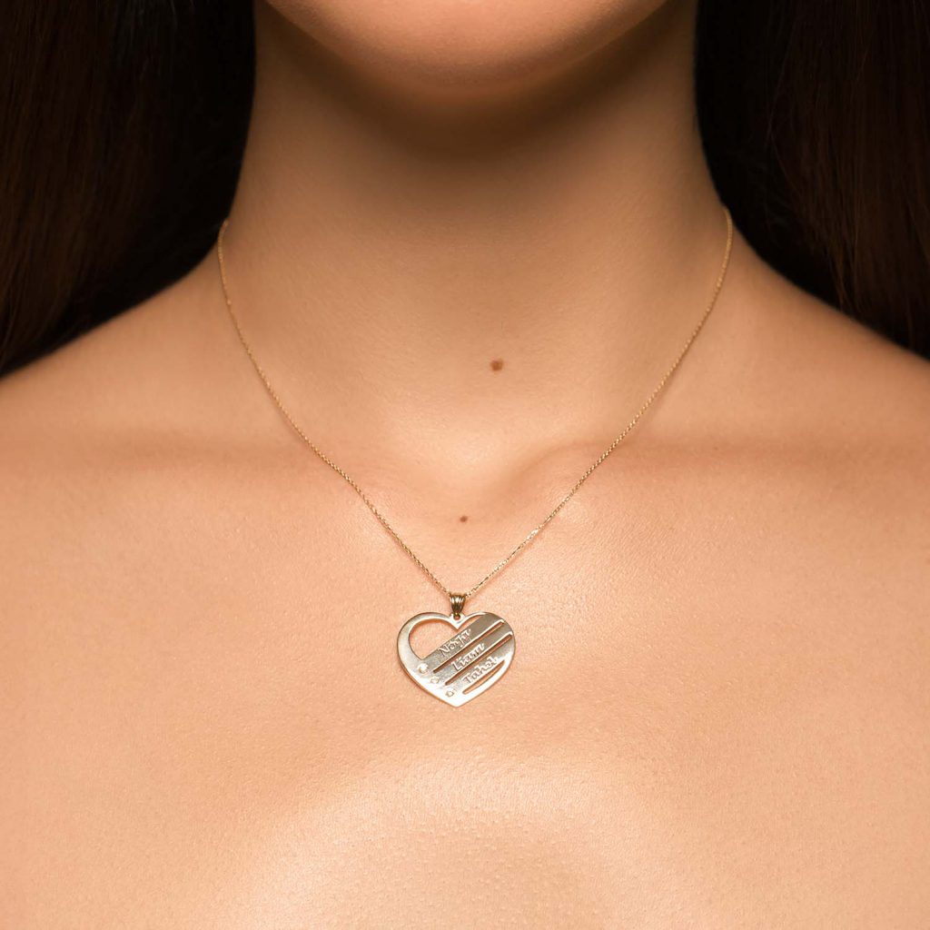 שרשרת זהב לב – חריטה 3 שמות + יהלומים