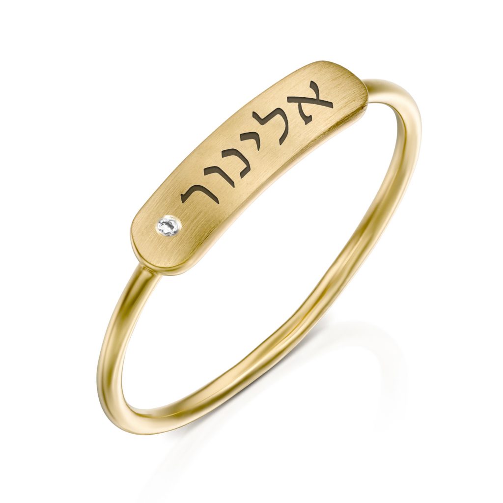 טבעת זהב 14K עם חריטה אישית ושיבוץ של יהלום נקודה לבן.