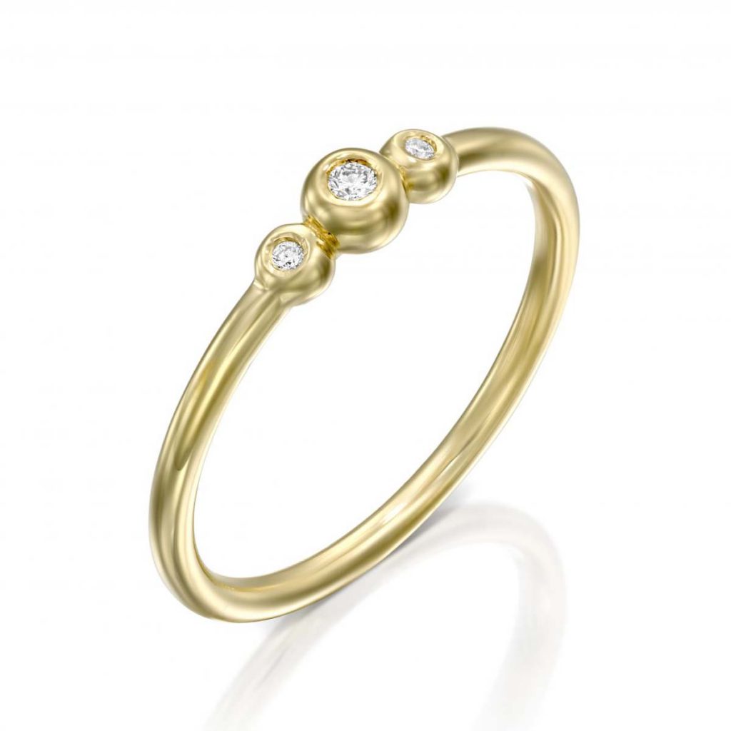 טבעת יהלומים בעיצוב עדין ומודרני, יהלומים משובצים בצורת עיגולים בגדלים שונים על טבעת מעוצבת מזהב 14k.