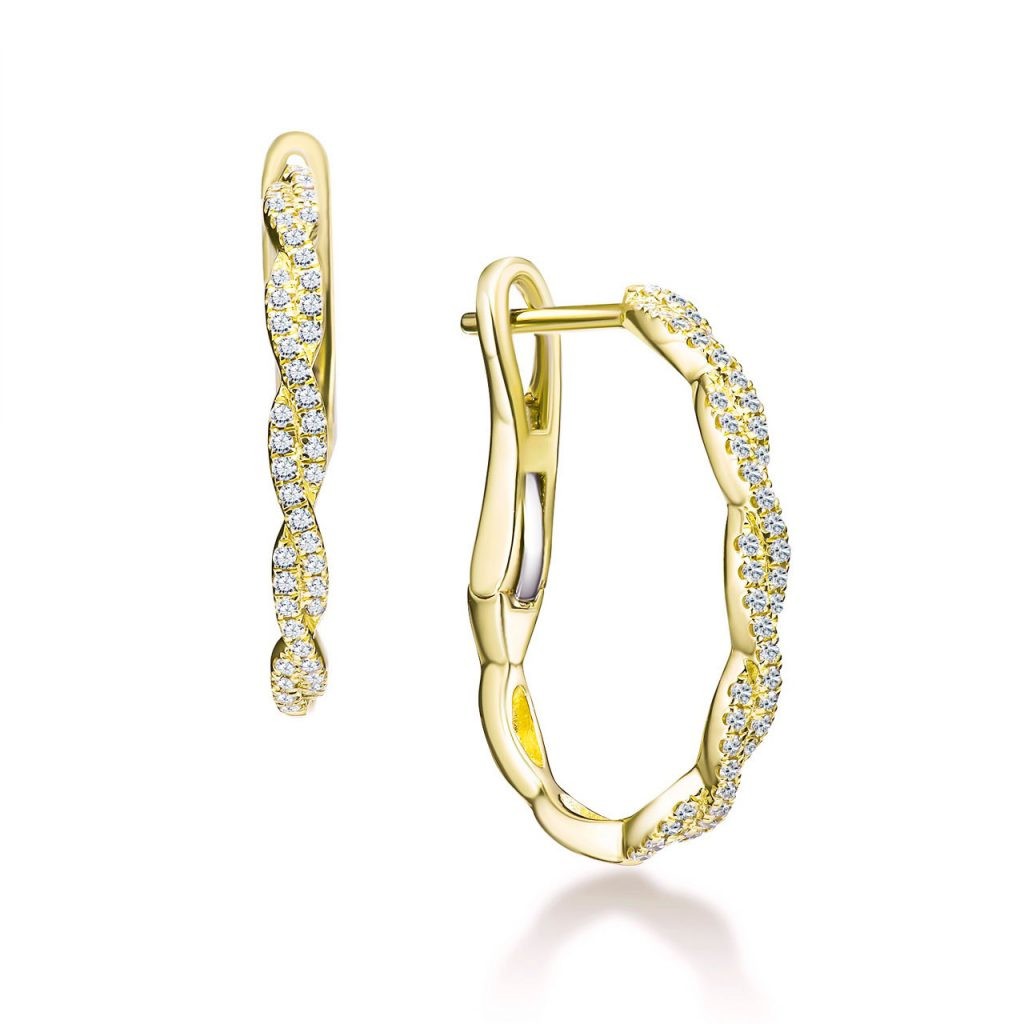 עגילי יהלומים זהב 14k משובצים יהלומים בשתי שורות המשתלבות אחת בשניה.