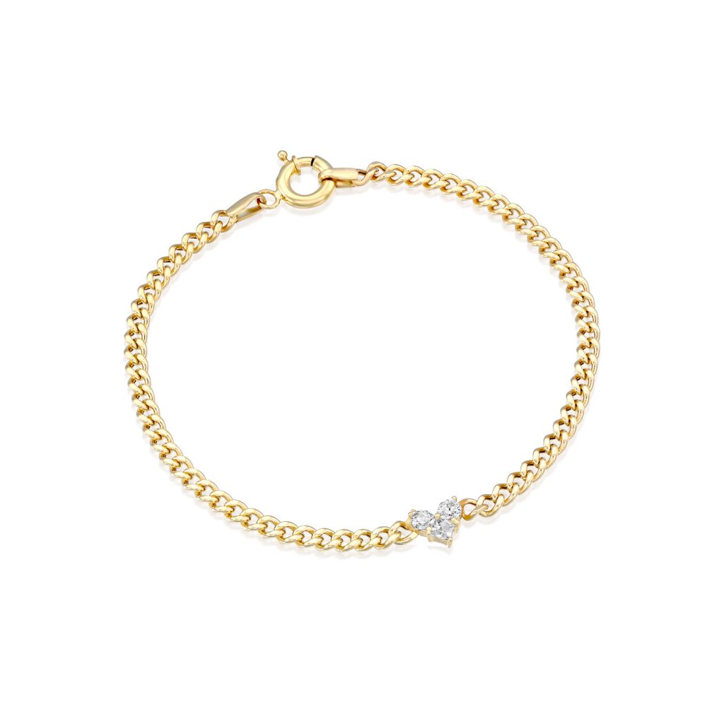 צמיד זהב 14K עדין ויפה משובץ 3 זרקונים היוצרים צורת לב