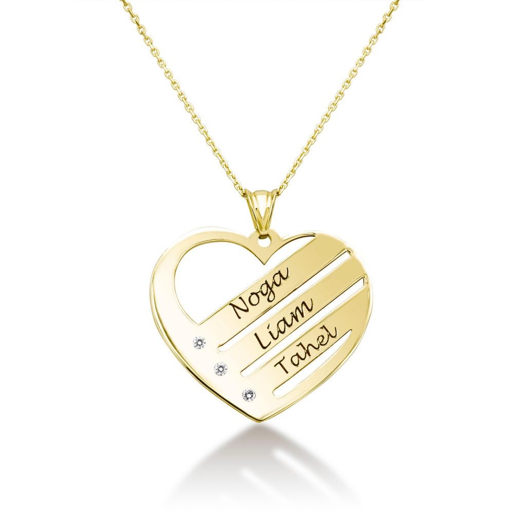 תליון זהב 14K בצורת לב עם אפשרות לחריטה אישית של 3 שמות (או תאריכים) + 3 יהלומים.